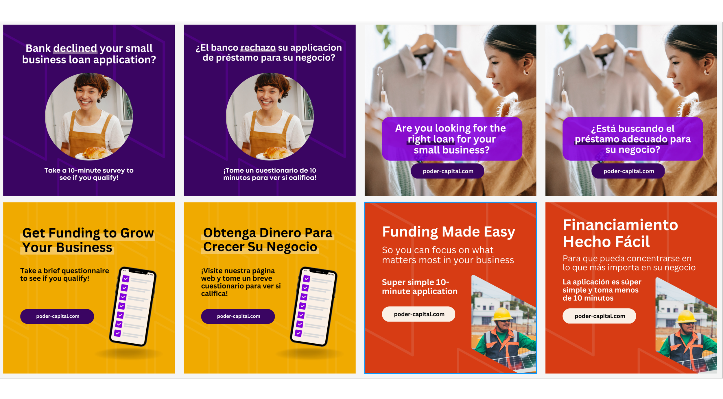 I created and ran social ads to understand what messaging was most compelling. When clicked, the ad led to a landing page and then a Typeform to collect information about their businesses and capital needs. In subsequent ads, I increased landing page conversion by 16%.