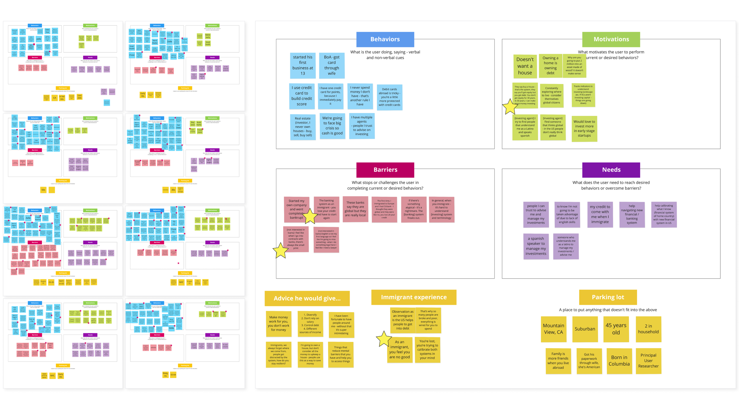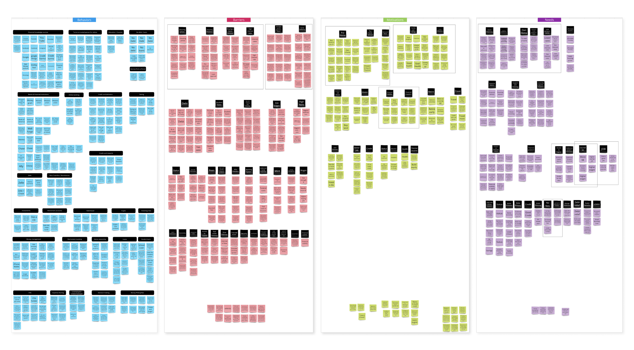 We began by talking to people in the Latinx community to better understand their behaviors, barriers, motivations, and needs around money. The team completed 24, 1-on-1 interviews, mostly in Spanish. I facilitated all the debrief sessions, capturing the most important insights from each interview. When the interviews were complete, I facilitated a synthesis workshop. We grouped and themed all of the insights from the interviews.